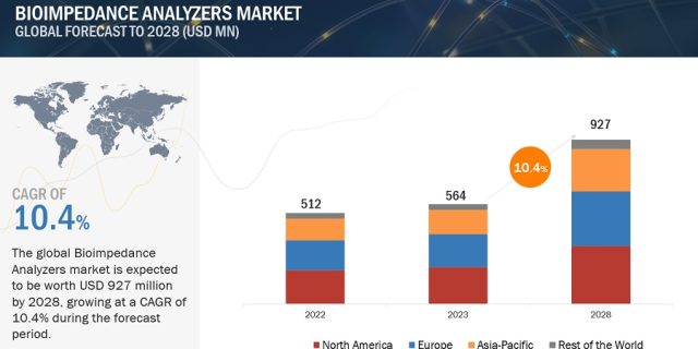 As per the recently published report by MarketsandMarkets™, The report “Bioimpedance Analyzers Market by Type (Single, Multi & Dual Frequency), Modality (Wired, Wireless), Application (Segmental Body Measurement, Whole Body Measurement), End User (Fitness Clubs, Home Users, Hospitals), & Region- Global Forecast to 2028″, is projected to reach USD 927 million by 2028 from USD 564 million in 2023, at a CAGR of 10.4% during the forecast period.