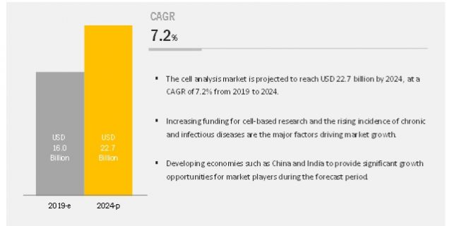 The Cell Analysis Market is expected to reach USD 22.7 billion by 2024 from USD 16.0 billion in 2019, at a CAGR of 7.2%. from 2019 to 2024