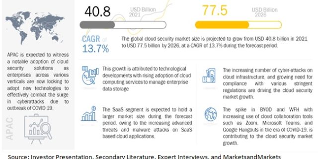 The global Cloud Security Market size is expected to grow from USD 40.8 billion in 2021 to USD 77.5 billion by 2026, at a Compound Annual Growth Rate (CAGR) of 13.7% from 2021 to 2026 according to report published by MarketsandMarkets. The major growth drivers for the market include the increasing number of security breaches and cyberattacks on cloud infrastructure, and strict regulatory compliances toward adoption of cloud services.