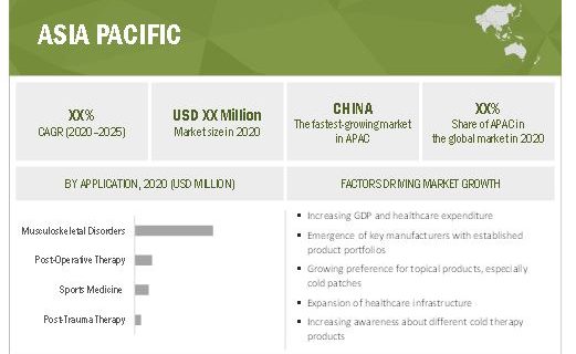 The emerging Asian countries, such as China, India, South Korea, Japan and Singapore, are offering high-growth opportunities for market players. The Asia Pacific cold pain therapy market is projected to grow at the highest CAGR of 5.6% from 2020 to 2025. Growing preference for topical products, especially cold patches, expansion of helathacre infrastructure, growing awareness of cold therapy products the region. Moreover, emergence of key players with established prpduct portfolio are driving the growth of the APAC pain therapy market.
