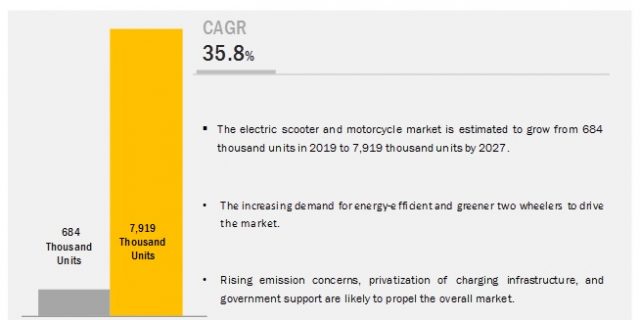 The Electric Scooter and Motorcycle Market is expected to grow from 684 thousand units in 2019 to reach 7,919 thousand units by 2027, at a CAGR of 35.8%. The growing trend of greener transport is the major factor responsible for the expected advancements in this market. OEMs worldwide are investing heavily in research & testing applications leading to continuous advancements in electric two-wheelers and charging solutions. In March 2019, Harley-Davidson, the US-based two-wheeler manufacturer, announced that it had acquired StaCyc, manufacturer of the 12 EDRIVE and 16 EDRIVE electric two-wheelers, predominantly designed for kids. The acquisition broadens the electric two-wheeler portfolio to grow the next generation of Harley-Davidson Riders and lead the electrification of two-wheelers.