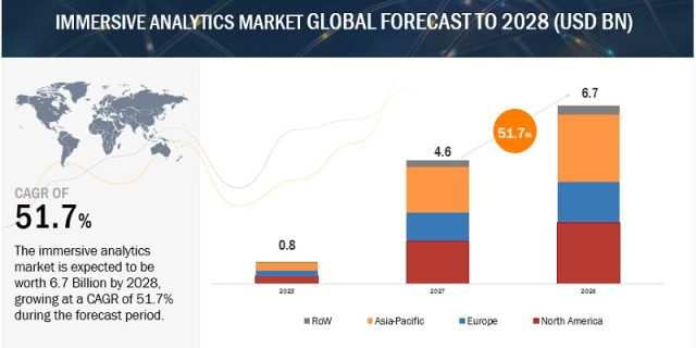 The global Immersive Analytics Market size is projected to grow from USD 0.8 billion in 2023 to USD 6.7 billion by 2028, at a CAGR of 51.7% during the forecast period, according to report published by MarketsandMarkets.