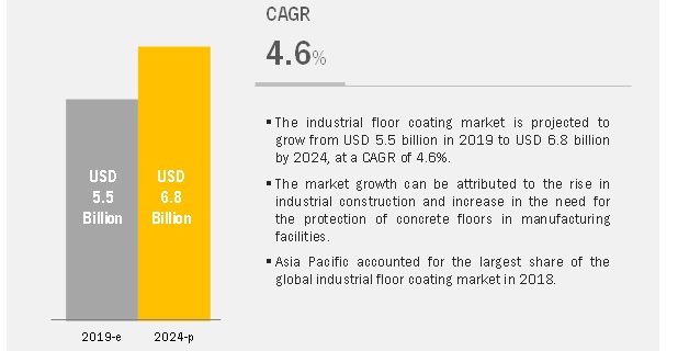The global industrial floor coating market size is projected to grow from USD 5.5 billion in 2019 to USD 6.8 billion by 2024, at a Compound Annual Growth Rate (CAGR) of 4.6% during the forecast year. The growth of this market is attributed to the industrial expansion in emerging economies as well as increasing need to protect, maintain, and repair floors in industrial and commercial facilities.