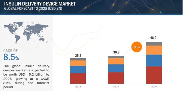 The report Insulin Delivery Devices Market is expected to grow at a CAGR of 8.5% from USD 30.8 Billion in 2023 to USD 46.2 billion in 2028.