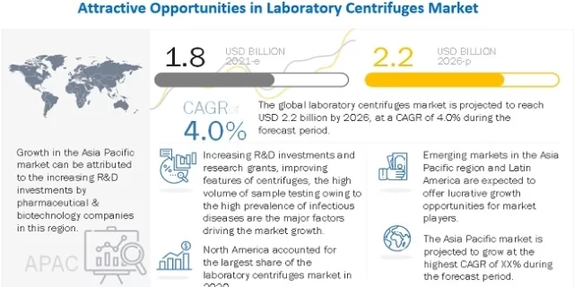 Expected Revenue Growth: The laboratory centrifuges market is projected to reach USD 2.2 billion by 2026 from USD 1.8 billion in 2021, at a CAGR of 4.0% from 2021 to 2026. increasing R&D investments and research grants; rising technological advancements and innovative rotor designs; increasing prevalence of infectious diseases leading to a higher volume of sample testing & cell-based research in laboratory centrifuges; and widening applications of laboratory centrifuges.