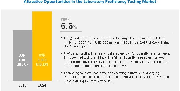 The Laboratory Proficiency Testing Market is projected to reach USD 1,103 million by 2024 from USD 800 million in 2019, at a CAGR of 6.6% during the forecast period.