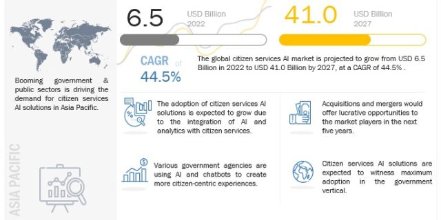 The global Citizen Services AI Market size is projected to register a CAGR of 44.5% during the forecast period, reaching USD 41.0 billion by 2027 from an estimated USD 6.5 billion in 2022 according to report published by MarketsandMarkets. Al and chatbots are being used by various …