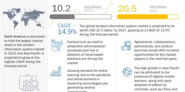 The global Student Information System Market size is estimated to grow from USD 10.2 billion in 2022 to USD 20.5 billion by 2027, at a Compound Annual Growth Rate (CAGR) of 14.9% during the forecast period, according to report published by MarketsandMarkets.  The Student Information System Market …