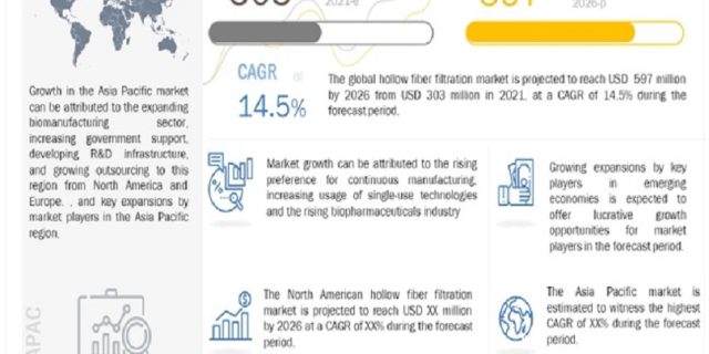 The global Hollow fiber filtration market is projected to reach USD 597 million by 2026 from USD 303 million in 2021, at a CAGR of 14.5% during the forecast period.