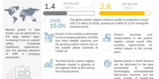 The global Patient registry software market is projected to reach USD 2.8 billion by 2026 from USD 1.4 billion in 2021, at a CAGR of 15.0% during the forecast period.