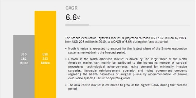 The surgical smoke evacuation market is estimated to grow at a CAGR of 6.6% to reach USD 223 million by 2024 from USD 162 million in 2019.